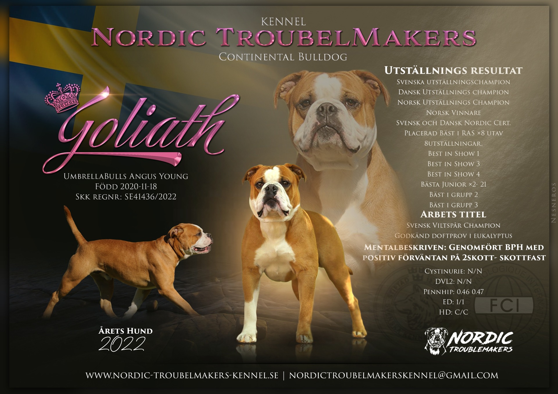 Årets Hund år 2022- Är en otroligt fin titel att få tilldelad, Goliath gör det ännu en gång och är först i rasen med denna titeln utdelad av Continental bulldogs Special klubb- Svenska Molosser & Herdehundsklubben. Att bli NR 1 krävs att man tävlar i poäng mot ALLA ingående Molosser och Herdehundsraser som ingår under SMHK.